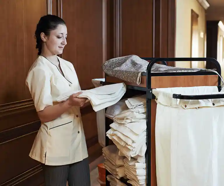 Verräumen, Waschen und Trocknen die Hotelwäsche.