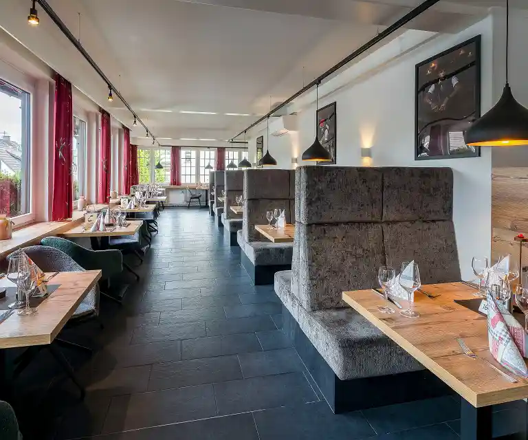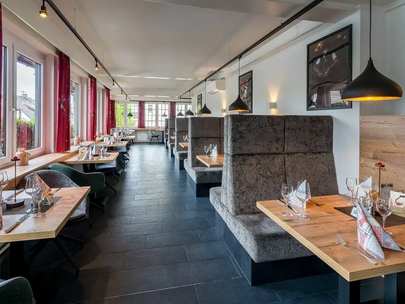 im Restaurant Hannikel im Haupthaus mit Salatbuffet, hausgemachtem Kuchen, Frucht- und Cremeeis, Wasser, Sprudel und Fruchtsaft.
