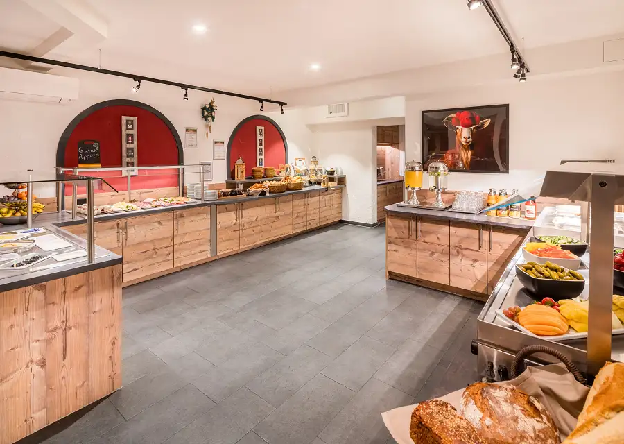 Abwechslungsreiches Buffet mit Schwarzwälder Spezialitäten. Frisch gebackene Brötchen, verschiedene Brotsorten der Backstube „Rupp“ und süßes Gebäck, verschiedene Schinken und Salami, Schnittkäse und Weichkäse am Stück, verschiedene Schwarzwälder Marmeladen, Butter, Margarine, Frischkäse, Honig und Nougatcreme. Eine Müsliecke mit vielseitigem Angebot, frischen Früchten, Obstsalat und verschiedenen Joghurt und Quarkspeisen. Warme Eierspeisen, Säfte, Kaffee und Tee.