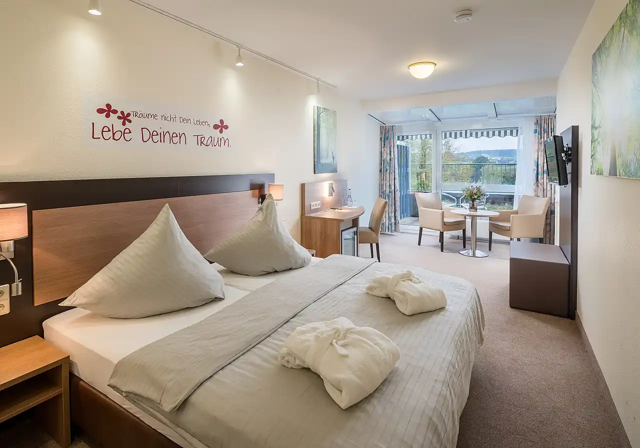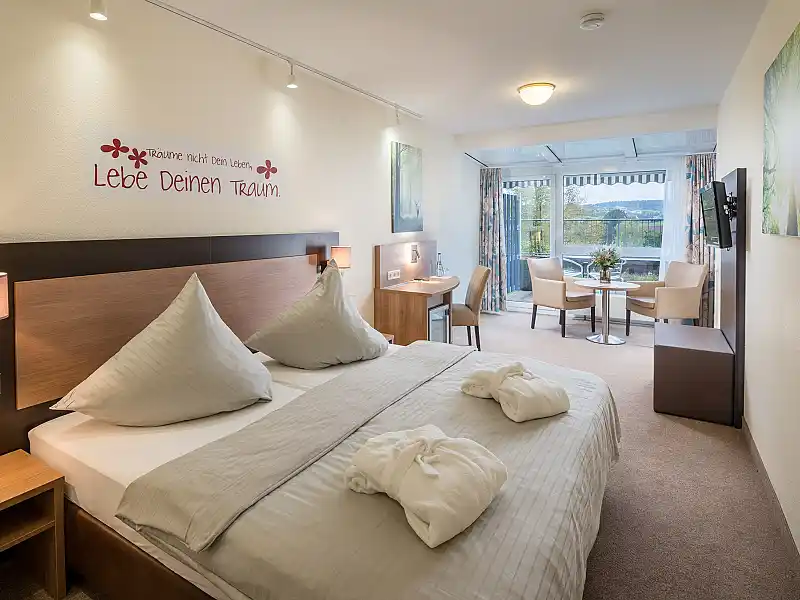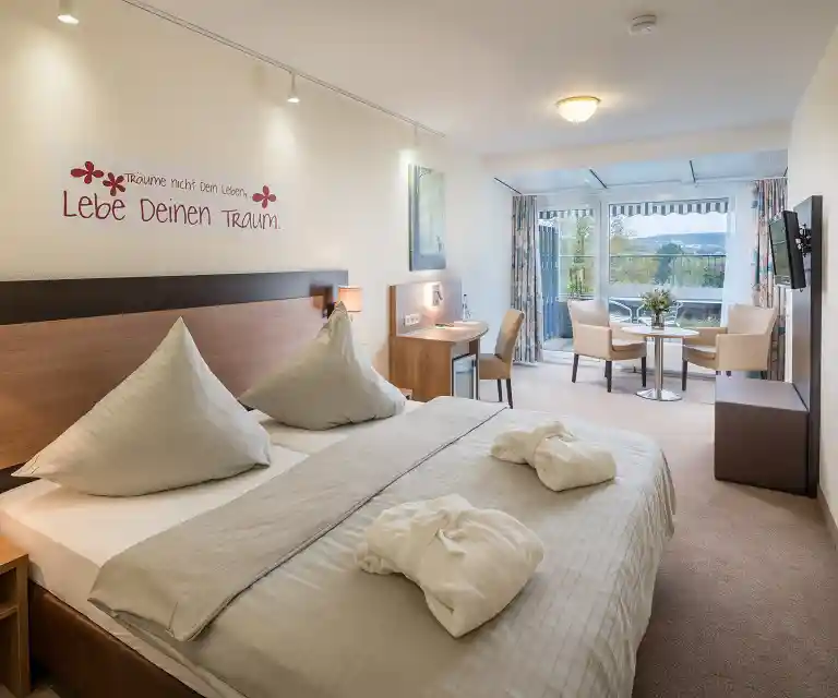 Zimmergröße: 26m², Doppelbett 1,80m x 2,00m, Bequeme Sitzmöglichkeit, Kühlschrank, Safe, Smart-TV, Balkon oder Terrassen, Kleines Bad mit Dusche, Kein Hund möglich.