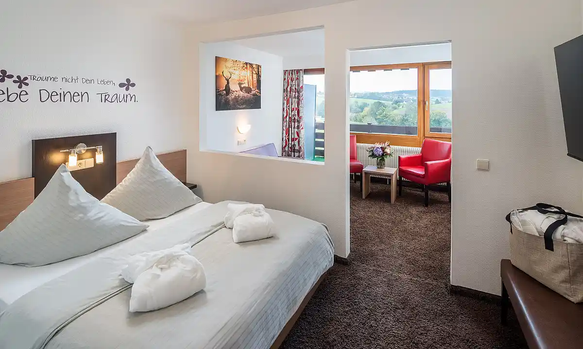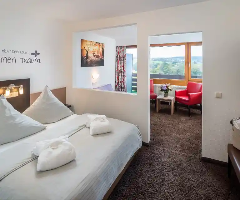 Zimmergröße: 26m², Badezimmer mit Dusche, Großer privater Balkon mit Panoramaaussicht und Blick ins Tal, separater Sitzbereich, Minibar mit einer Füllung bei Anreise inklusive, Kaffee- und Teezubereitung im Zimmer
